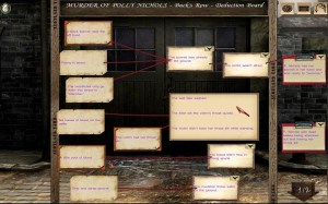 O “deduction board” é algo então de relevante importância, onde iremos correlacionar todas as pistas, documentos e depoimentos (que podemos consultar a qualquer momento no jogo) e daí deduzir e retirar algumas conclusões, como as condições em que os assassinatos decorreram, quando ocorreram e eventualmente calcular a localização provável do assassino bem como a sua identidade. É precisamente este trabalho de detective que demarca os jogos Sherlock Holmes dos restantes jogos de aventura clássicos e, uma vez mais, me pareceram muito bem conseguidos.
