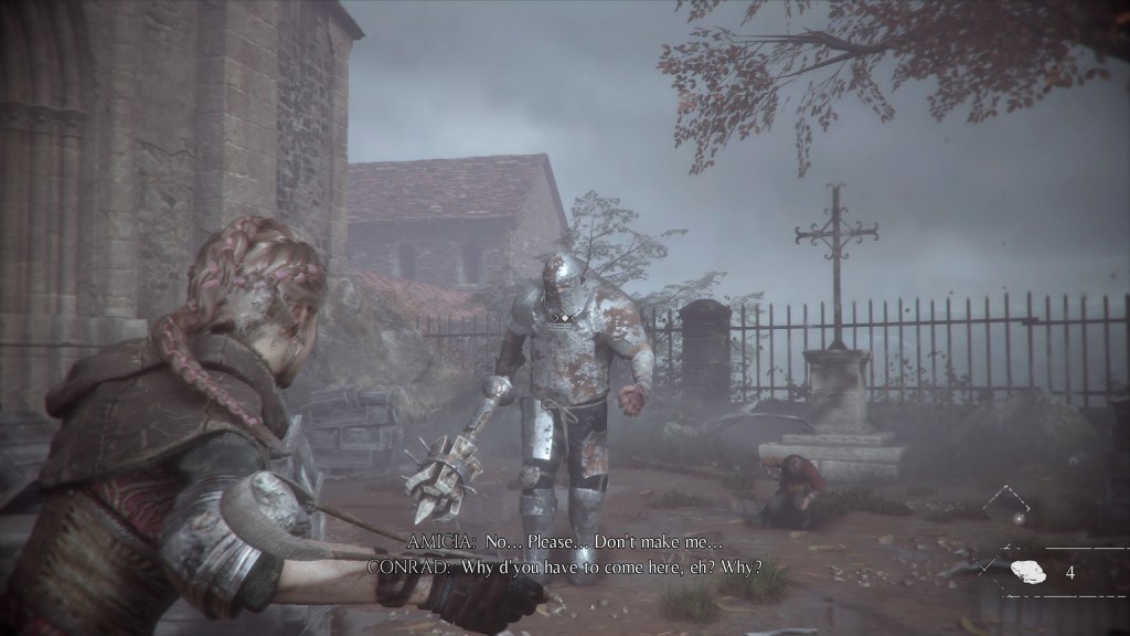 E a única arma que temos é uma fisga, pelo que ao longo de toda a aventura teremos de ter uma abordagem mais furtiva quando enfrentamos soldados. Mas não são só outros humanos adultos que temos de ter cuidado ao longo do jogo, mas também as ratazanas em grande número que surjem em zonas escuras e devoram tudo por onde passam. E estamos apenas munidos de uma fisga, pelo que devemos evitar confronto sempre que possível, ao mover nas costas dos soldados, atirar pedras ou outros objectos para os distrair e passar despercebidos, mas quando o confronto é inevitável lá temos de usar a fisga para uns headshots bem colocados. Mas o jogo tem também um grande foco na alquimia e iremos ganhar novas habilidades com o decorrer da história. Podemos criar projécteis flamejantes capazes de acender fogueiras (muito útil para atravessar zonas infestadas com ratazanas), projécteis que causam enorme desconforto em soldados com armadura, fazendo-os retirar o seu capacete, deixando-os vulneráveis a um headshot. Ou criar projécteis capazes de apagar fogueiras, criando armadilhas para as ratazanas devorarem inimigos, entre outros com funcionalidades interessantes e que deixo que os jogadores as descubram!