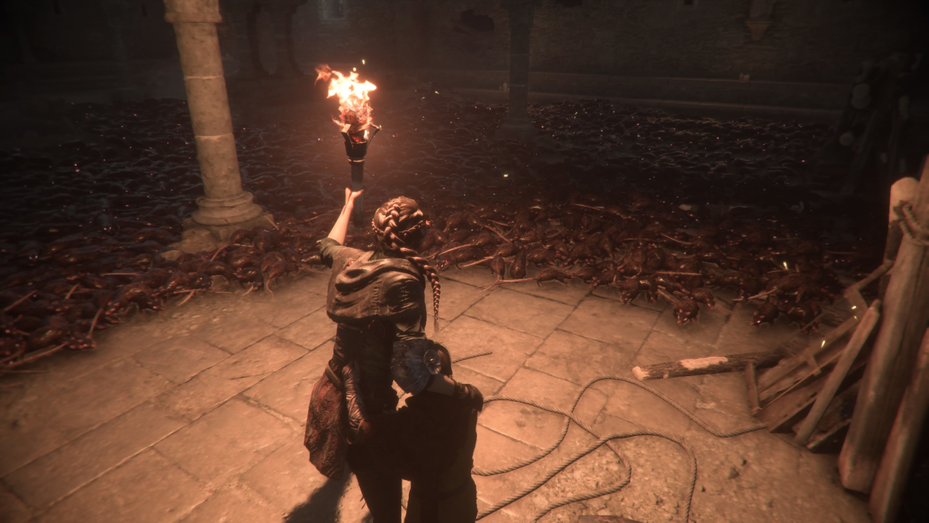 Visualmente é também um jogo excelente. Não é segredo que adoro representações da era medieval, sejam em jogos de fantasia, ou com mais algum realismo. E aqui neste Plague Tale a Asobo conseguiu apresentar uma fina linha entre realismo e fantasia, apresentando-nos um mundo medieval muito opressor, não só pela praga que dizimou milhões de pessoas no século XIV, mas também pela constante ameaça de uma Inquisição sem escrúpulos. É um jogo com uma apresentação muito bem conseguida, tanto nos cenários, como no voice acting ou mesmo a nível técnico, como os excelentes efeitos de luz, ou detalhe gráfico nas personagens e cenários à nossa volta.