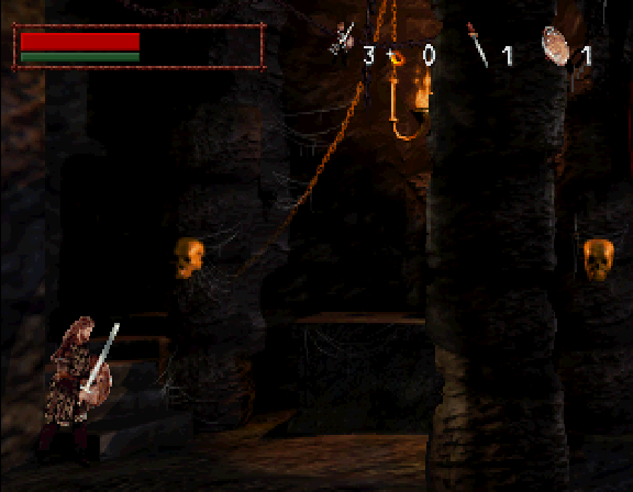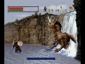 Depois temos outros itens a encontrar desde diferentes tipos de flechas que podemos usar a partir do momento que desbloqueamos o arco, power ups de armadura ou da nossa espada, ou invencibilidade temporária. Para além disso, se explorarmos bem os níveis poderemos encontrar alguns NPCs que nos aumentam as barras de vida e fadiga, ou nos ensinam novos golpes especiais. Ocasionalmente lá teremos aqui alguns quick time events nalguns segmentos do jogo onde viajamos nas costas de um dragão. Aqui temos uma pequena cutscene em full motion video a correr em plano de fundo e teremos de pressionar o D-pad nas direcções que aparecem no ecrã, para guiar o dragão em segurança até ao nosso destino.