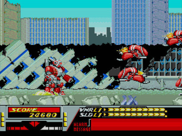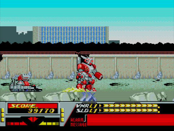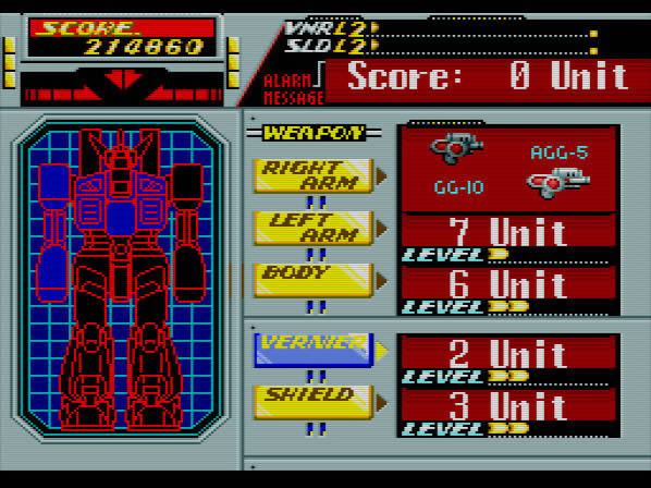 O d-pad serve para nos movermos pelos cenários mas também para saltar. Pressionando o direccional para baixo faz com que o mecha mude de direcção, enquanto o ecrã faz scrolling constante para a direita. Já os botões faciais servem para usarmos diferentes armas. Um controla o braço esquerdo do mecha, que por sua vez é usado para desferir ataques de curto alcance, socos com algum poder explosivo que causam também dano a curta distância. O outro botão facial controla o braço direito, que poderá ter diferentes armas de fogo equipadas. Pressionando ambos os botões faciais em simultâneo activam pequenos canhões que o mecha possui no seu peito e esse fogo pode inclusivamente ser redireccionado com o d-pad, sendo por isso o método de combate de eleição para se usar contra alvos que estão abaixo do alcance dos nossos braços, por exemplo. No canto inferior direito do ecrã vemos duas barras de energia importantes: vernier (energia dos boosters que nos permitem manter no ar breves momentos após os saltos) e os escudos, que por sua vez vão-se regenerando lentamente sempre que estivermos alguns segundos sem sofrer dano (o que é difícil). No final de cada nível, mediante a nossa performance, somos recompensados com novas armas de fogo que podem ser equipadas no braço direito, bem como outros pontos que poderão ser redistribuídos para melhorar certos aspectos do mecha, incluindo o dano dos socos, escudos adicionais ou melhores boosters que nos permitem manter mais tempo no ar.