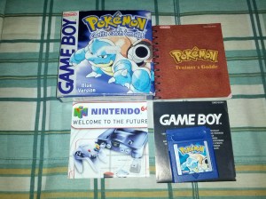 Em vez do Pokémon Blue, gostaria antes de estrear uma rubrica sobre a famosíssima série de RPGs da Nintendo com o Pokémon Yellow. Isto por uma razão muito simples. Antes de as animações de Pokémon terem chegado ao nosso país, eu não gostava de RPGs. Bastava jogar uns 5 minutos daquilo que me fartava logo de tamanha lentidão, pelo que me deixei sempre ficar com os meus platformers, first person shooters e outros géneros com mais acção. Mas com a moda de Pokémon a tomar Portugal inteiro de assalto, e consequentemente os seus 3 jogos de Gameboy a receberem excelentes pontuações em todo o lado, resolvi finalmente embrenhar-me nesse mundo dos RPGs nipónicos que outrora foram tão estranhos para mim. Não o fiz unicamente com o Pokémon Yellow, mas também com o Phantasy Star IV na Mega Drive (adorava aquelas cutscenes anime) e o Chrono Trigger, por ter Akira Toryiama como designer das personagens. A partir daí passei a gostar bastante de RPGs japoneses e muito mais tarde, passei também a gostar dos “nossos” RPGs mais maduros e complexos. Mas enquanto não tenho um cartucho do Pokémon Yellow na minha gaveta (oportunidades não faltaram, eu é que vivia num mundo de fadas onde achava que facilmente conseguiria comprar qualquer jogo de Gameboy completo a um bom preço), deixei-me desleixar. Até que vi este Pokémon Blue a 4€ na Cash converters de Alfragide e o levei para casa. Era só o cartucho, mas eventualmente acabei também por encontrar numa loja do porto a caixa e os manuais por um preço irrisório.
