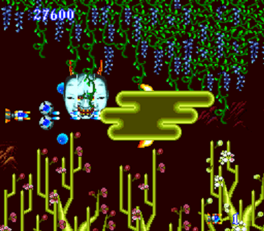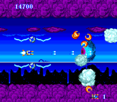 No que diz respeito à jogabilidade, as coisas são relativamente simples, com um dos botões faciais a servir para disparar e outro para rodar as options que eventualmente poderemos encontrar e que voam ao nosso lado. Mas claro, começamos o jogo sem qualquer power up ou satélites e estes terão de ser coleccionados na forma de esferas com várias letras e se perdermos alguma vida também perdemos tudo. Os itens que encontramos são power ups na forma de letras que inicialmente nos dão satélites e depois de termos os satélites equipados conferem-nos diferentes armas, ou mesmo vão as deixando cada vez mais poderosas se conseguirmos apanhar itens com a mesma letra. Outros podem-nos aumentar a velocidade da nossa nave ou dar-nos preciosos escudos. A mecânica de rodar os satélites é bastante interessante pois permite-nos ter uma boa versatilidade no nosso poder de fogo!