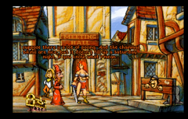 No que diz respeito às mecânicas de jogo, estas até que são bastante simples, onde com o ponteiro do “rato” a servir para todo o tipo de acções: mover, falar, interagir, observar, etc. Tudo dependerá do contexto! Teremos também 2 inventários a ter em conta, o pessoal, que permite carregar com 4 itens ou habilidades, e um inventário maior, que é nada mais nada menos do que uma espécie de animal de estimação de Rinceweed, um baú vivo com 8 patas e que nos segue para todo o lado. No caso da Sega Saturn, infelizmente esta versão não suporta o rato (até porque esse periférico acabou por não ser lançado na Europa), pelo que teremos de usar o d-pad para mover o ponteiro pelo ecrã. E isto pode irritar um pouco, porque o ponteiro mexe-se muito lentamente, mas enquanto mantivermos o direccional pressionado na mesma direcção, o ponteiro vai acelerando o seu movimento. Creio que acaba por ser uma questão de hábito, mas essa foi a principal razão que me levou a optar por jogar a versão PC em seguida. É que apesar dos controlos serem tecnicamente simples, o jogo em si é bastante difícil. Isto porque teremos uma imensidão de locais a explorar, personagens para falar, dezenas de objectos para coleccionar, combinar e usar… Para progredir, teremos de explorar os mesmos cenários vezes sem conta, a ver se descobrimos algo novo que possa ser interagido, ou algum diálogo novo com alguma personagem que até já possamos ter interagido antes. E tendo em conta que temos um mapa gigante da cidade para explorar, com certas localidades a serem desbloqueadas à medida que a história vai avançando… é algo que nos vai dar trabalho.