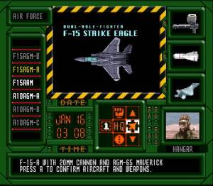Então em cada área temos vários pontos de interesse militar, como os tais radares que nos pedem para destruir na primeira missão, mas também bases aéreas, refinarias de petróleo, plataformas de lançamento de mísseis SCUD, fábricas de armas químicas, entre muitos outros, todos eles fortemente protegidos com tanques, baterias antiaéreas ou outros aviões, os caças MiG. Antes de partir em missão, podemos perder algum tempo a ver o mapa das áreas que temos de explorar, e o que podemos encontrar lá, desde instalações militares, a outros veículos inimigos. Para além disso podemos também optar por um de dois aviões: o caça F-15, ou o bombardeiro A-10, cada um com diferentes possibilidades de mísseis equipados. Depois lá partimos à aventura, tendo um número limitado de mísseis e combustível. Enquanto na série Strike conseguíamos encontrar munição e combustível espalhada pelo terreno de jogo, aqui temos mesmo de regressar à base. E enquanto estamos em jogo, o tempo passa, pelo que temos de gerir muito bem os recursos (bem como o nosso escudo) antes de regressar à base para depois voltar e continuar a mesma missão. Ora portanto, apesar de em cada zona temos outros alvos militares que podem não fazer parte da missão, destruí-los dá-nos sempre mais pontos, contribuindo para uma performance positiva no final da missão, mas não nos podemos distrair dos objectivos primários. E sim, se por acaso numa missão seguinte regressarmos a alguma zona já conhecida para destruir outra coisa qualquer, o dano que causamos nessa àrea na missão anterior mantém-se.