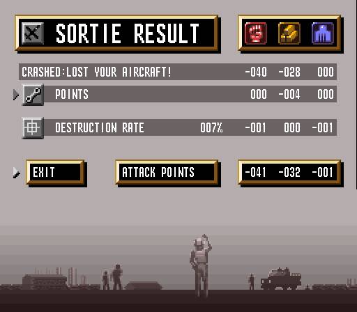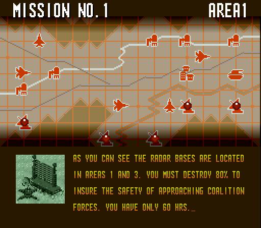 Então em cada área temos vários pontos de interesse militar, como os tais radares que nos pedem para destruir na primeira missão, mas também bases aéreas, refinarias de petróleo, plataformas de lançamento de mísseis SCUD, fábricas de armas químicas, entre muitos outros, todos eles fortemente protegidos com tanques, baterias antiaéreas ou outros aviões, os caças MiG. Antes de partir em missão, podemos perder algum tempo a ver o mapa das áreas que temos de explorar, e o que podemos encontrar lá, desde instalações militares, a outros veículos inimigos. Para além disso podemos também optar por um de dois aviões: o caça F-15, ou o bombardeiro A-10, cada um com diferentes possibilidades de mísseis equipados. Depois lá partimos à aventura, tendo um número limitado de mísseis e combustível. Enquanto na série Strike conseguíamos encontrar munição e combustível espalhada pelo terreno de jogo, aqui temos mesmo de regressar à base. E enquanto estamos em jogo, o tempo passa, pelo que temos de gerir muito bem os recursos (bem como o nosso escudo) antes de regressar à base para depois voltar e continuar a mesma missão. Ora portanto, apesar de em cada zona temos outros alvos militares que podem não fazer parte da missão, destruí-los dá-nos sempre mais pontos, contribuindo para uma performance positiva no final da missão, mas não nos podemos distrair dos objectivos primários. E sim, se por acaso numa missão seguinte regressarmos a alguma zona já conhecida para destruir outra coisa qualquer, o dano que causamos nessa àrea na missão anterior mantém-se.