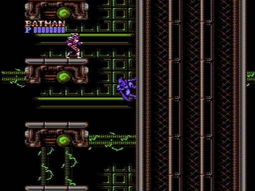 Agora para a parte do platforming… bom, o Batman aqui mexe-se como o Ninja Gaiden, podendo saltar de parede em parede, em vez de usar o seu gancho. Mas confesso que até prefiro assim! No entanto, e apesar deste ser um jogo desafiante, não é tão impiedoso quanto o Ninja Gaiden. Aqui também temos uma barra de vida, que pode ser restabelecida ao apanhar os power ups com a forma de corações – pena que não sejam tão abundantes quanto isso! Outros power ups servem apenas para aumentar a nossa pontuação. De resto convém referir que cada nível está dividido em diferentes secções, sendo que na última temos sempre um boss para defrontar, seja um vilão da DC Comics, seja uma máquina, como uma sala armadilhada.
