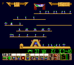 Ora então qual é o conceito deste Lemmings? Estas criaturas são roedores que vivem já perto do Árctico e ficaram muito conhecidos pelas suas suas concentrações em grande número e supostas tendências suicidas, ao serem filmados a atirarem-se de penhascos. Pelos vistos não são suicidas, mas também não sou especialista na espécie, de qualquer das formas a DMA design achou boa ideia desenvolver um jogo à volta desse conceito. Basicamente o que aqui teremos são dezenas de níveis cheios de obstáculos onde teremos de encaminhar um determinado número de Lemmings até á saída do mesmo. Para isso teremos ao nosso dispor uma série de habilidades que podemos assignar individualmente aos Lemmings que vão caindo de um alçapão. Mas quais as habilidades que temos disponíveis, bem como o número de vezes que as podemos assignar é também variável consoante o nível em questão, pelo que teremos de ser por vezes muito criativos e ocasionalmente, sacrificar alguns lemmings acaba memso por ser inevitável.